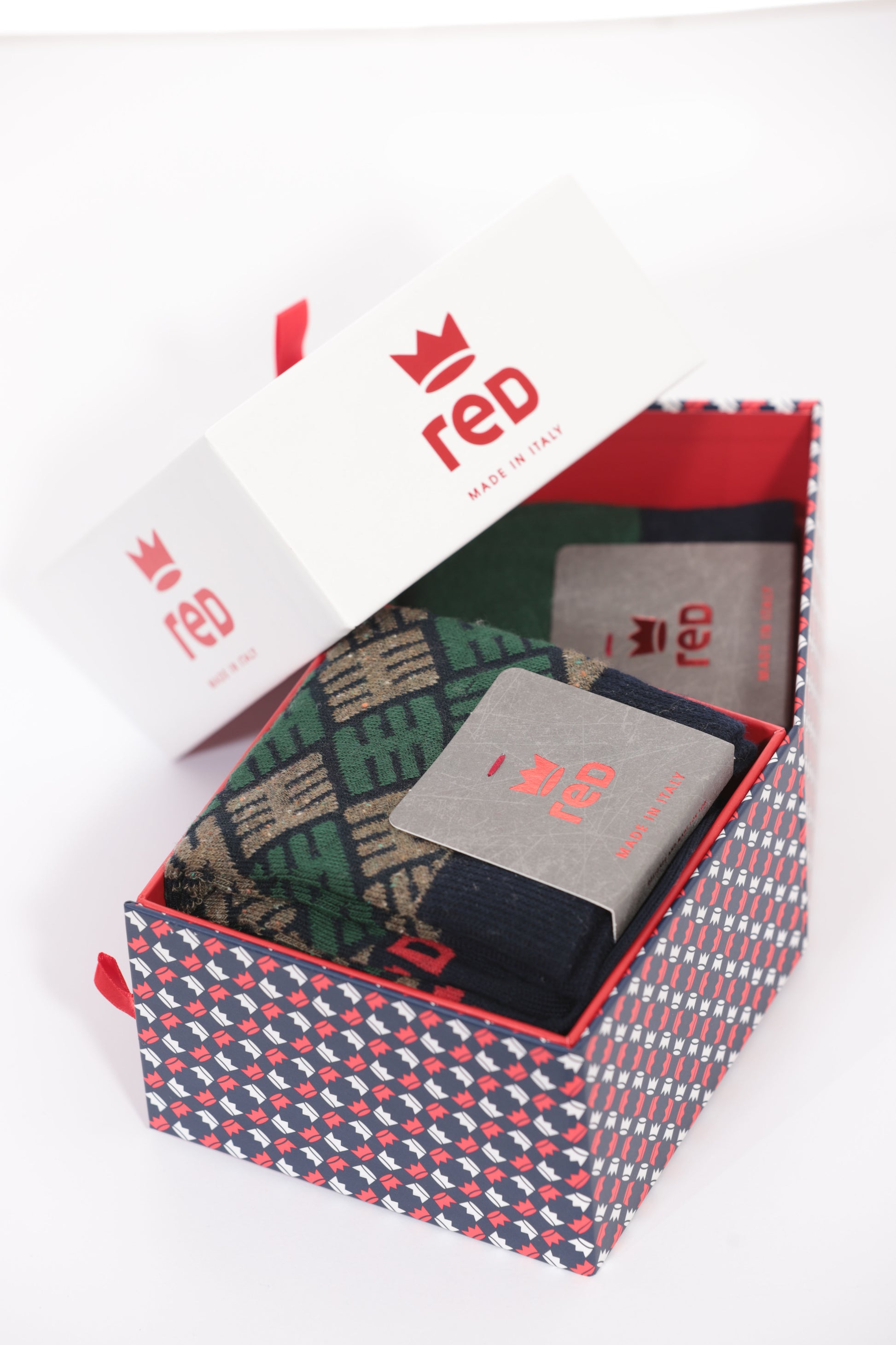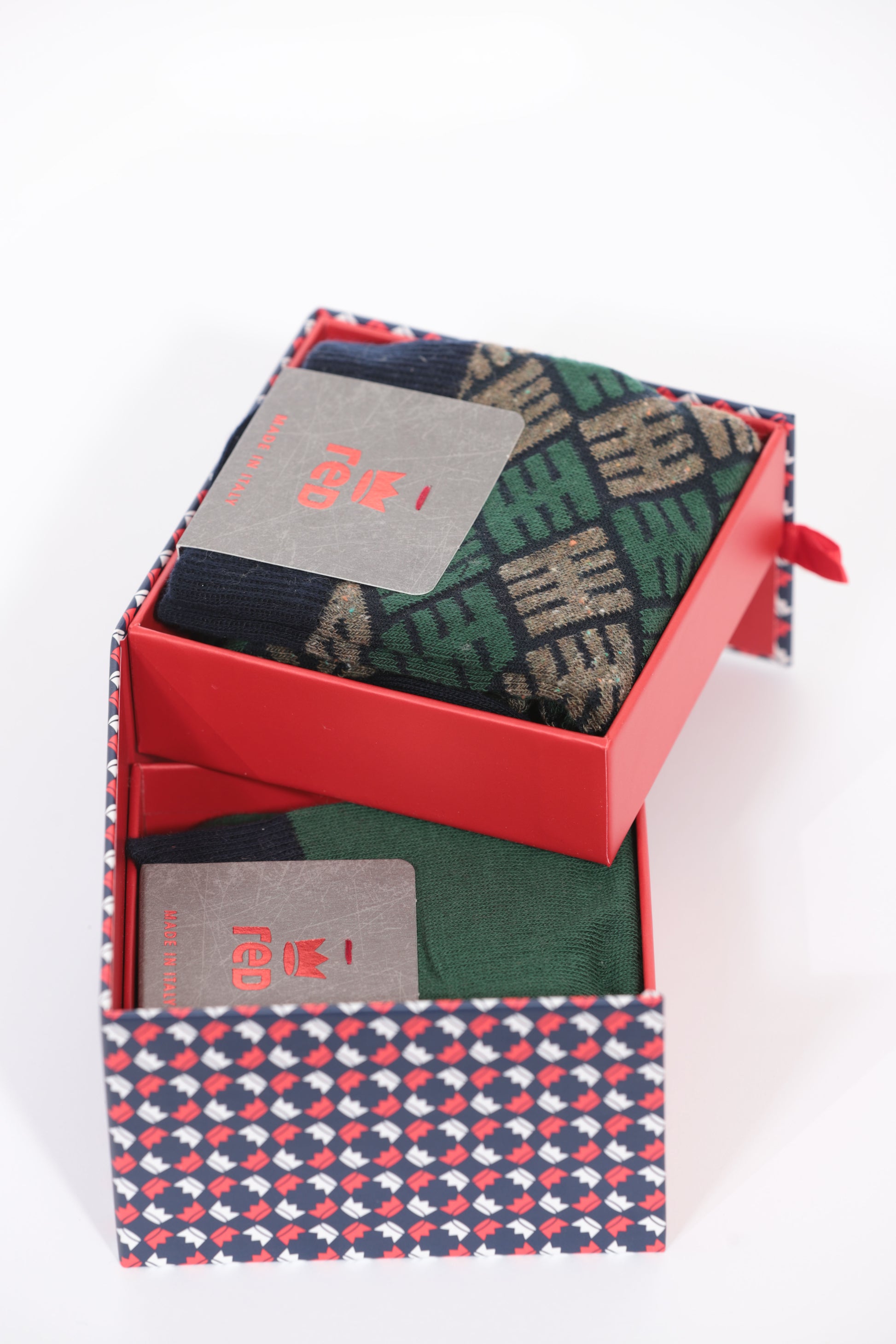 Box composta da due paia di calze in cotone sui toni del verde e blu, uno trama a puzzle, l'altro tinta unita bottonato, tessuto dalla superficie tridimensionale 'boutonè' costellata di bottoni ovvero di agglomerati di fibre.