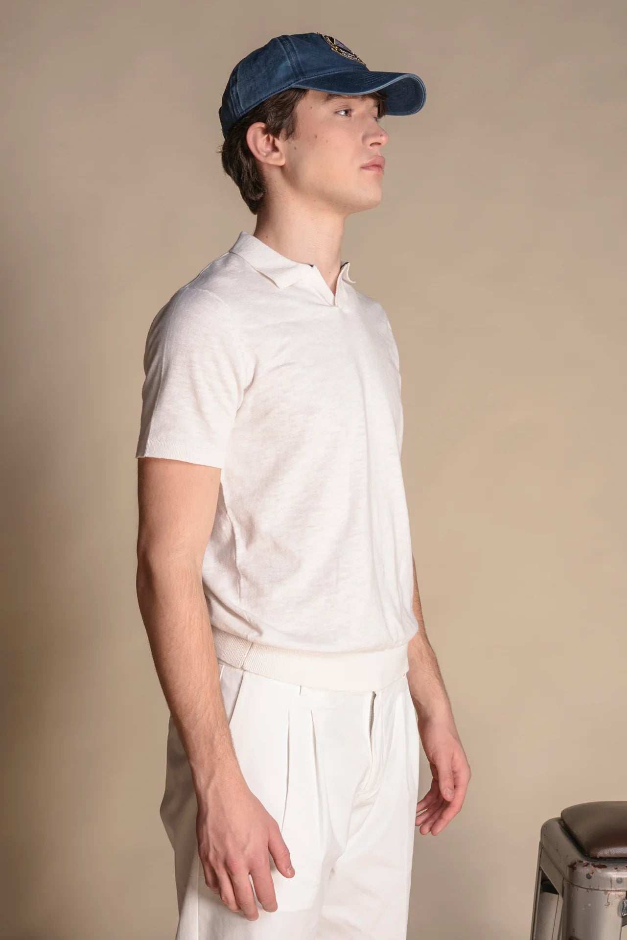 La polo skipper in cotone fiammato è un capo raffinato ma casual, perfetto per un look rilassato con un tocco di eleganza. Senza bottoni, con un'apertura a V che conferisce un aspetto più rilassato rispetto alla classica polo. Realizzata in cotone fiammato , un materiale con una texture leggermente irregolare che dona un effetto vissuto e morbido al tatto.