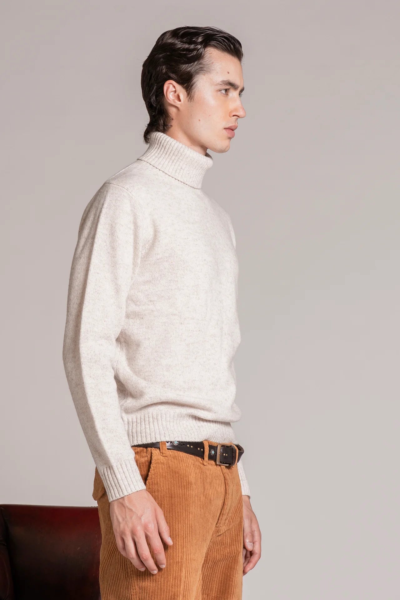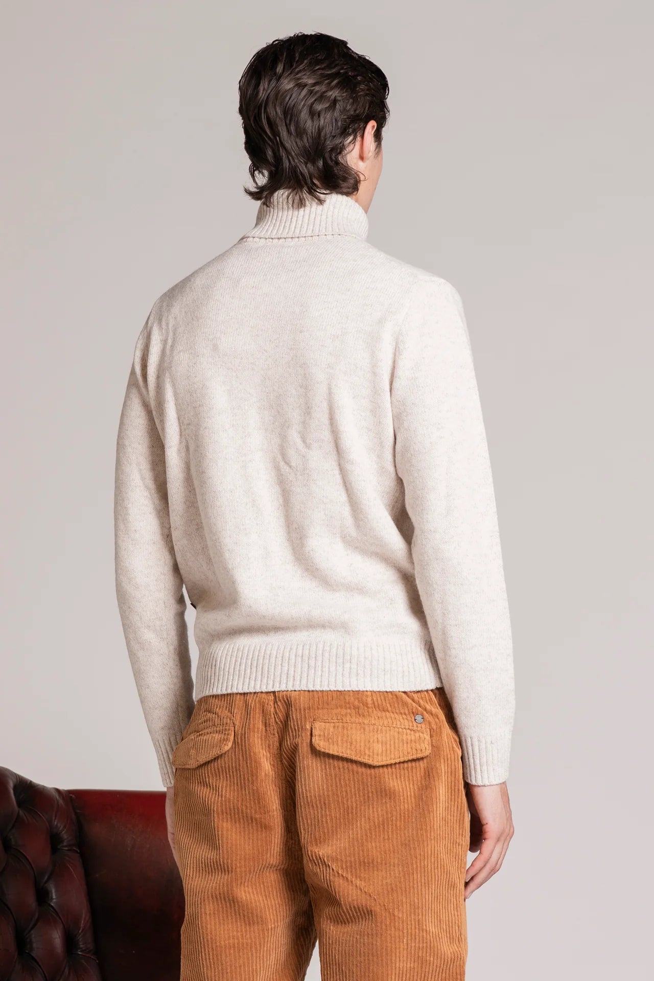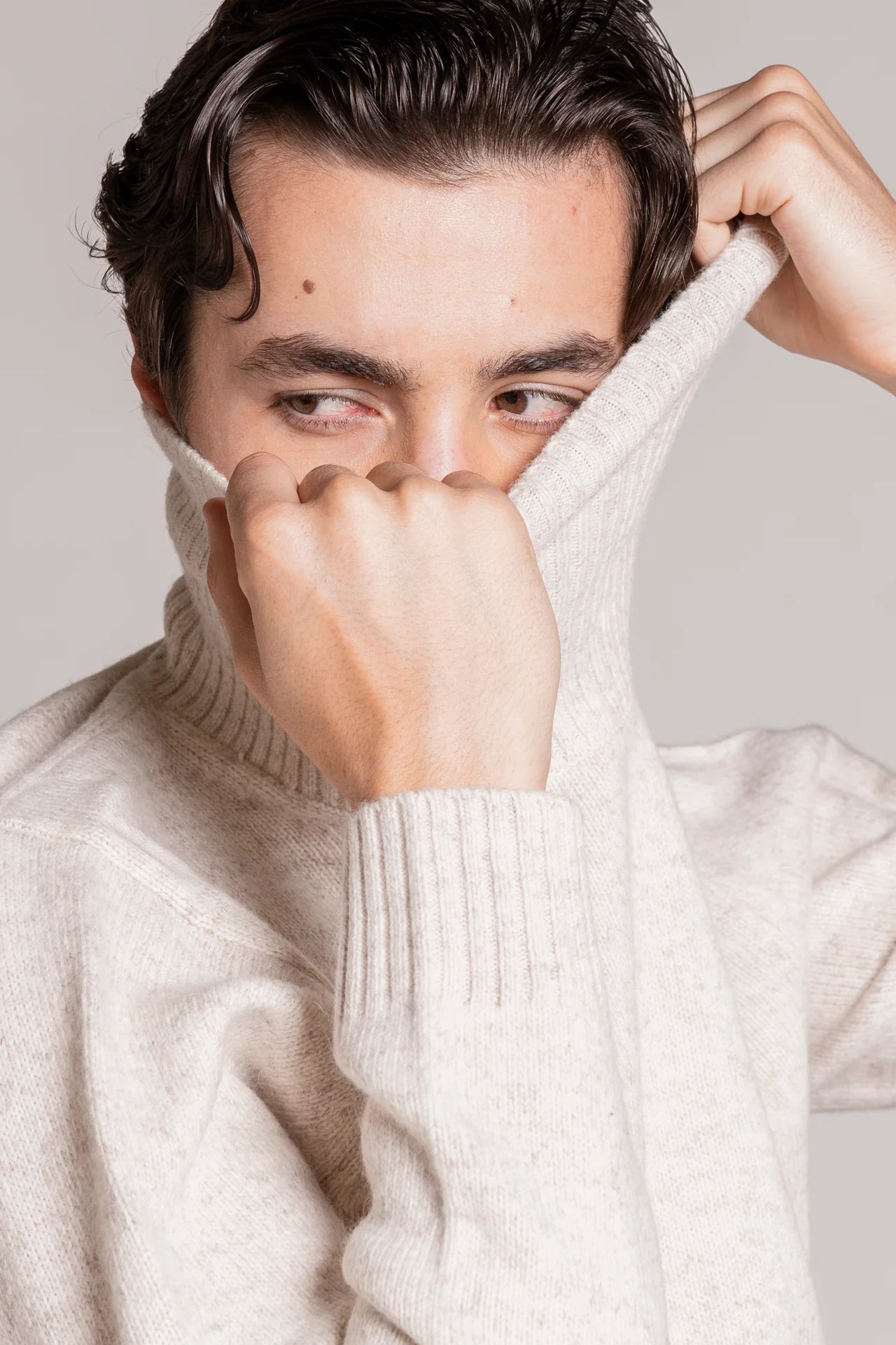 Maglione a collo alto realizzato in filato mouliné, che unisce tonalità diverse creando un effetto mélange ricco e materico. La lavorazione dona profondità cromatica e un aspetto autentico, mentre il collo alto assicura calore e protezione. Polsi e fondo in bordo a costine per una vestibilità confortevole e stabile. Un capo intramontabile, perfetto per look casual raffinati nelle stagioni fredde.